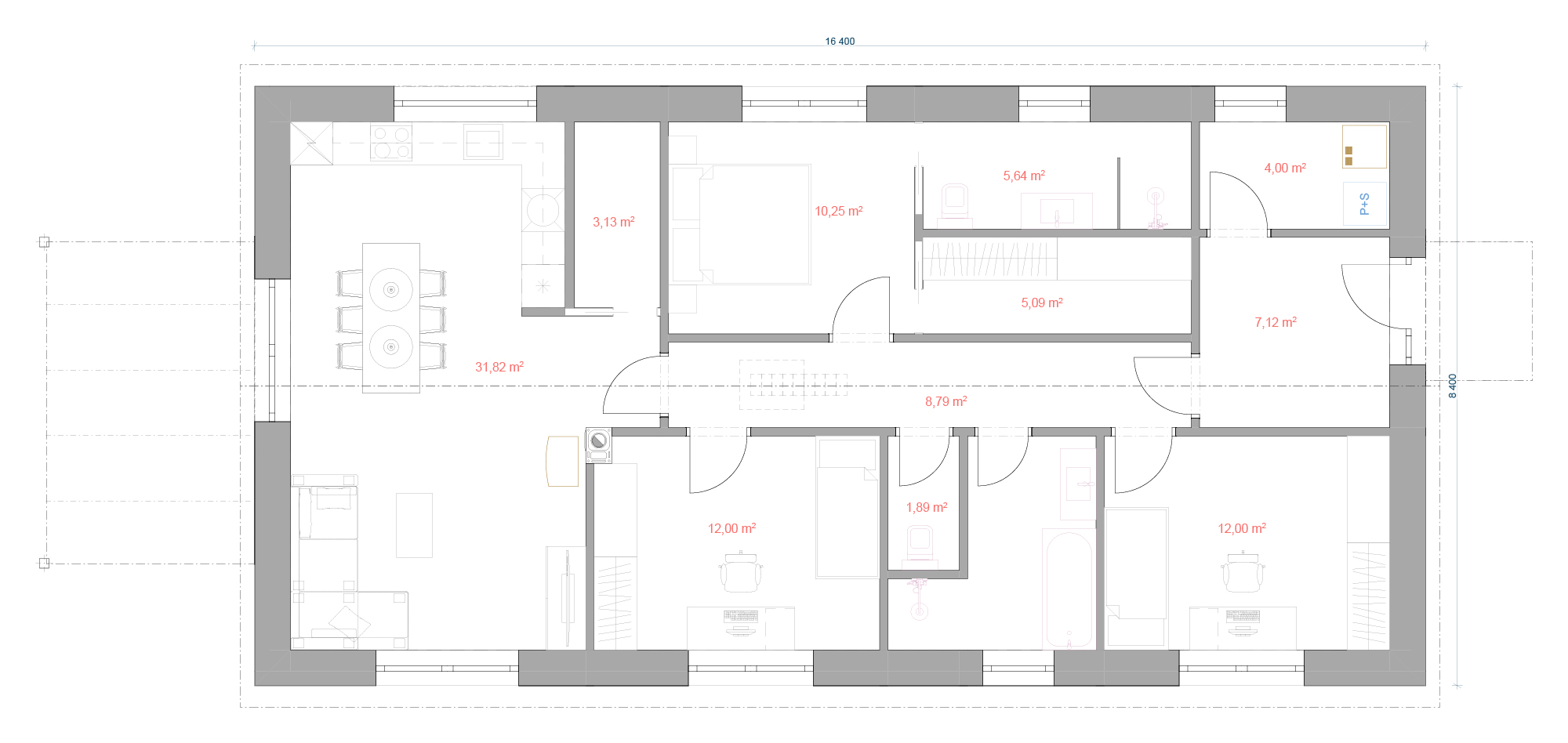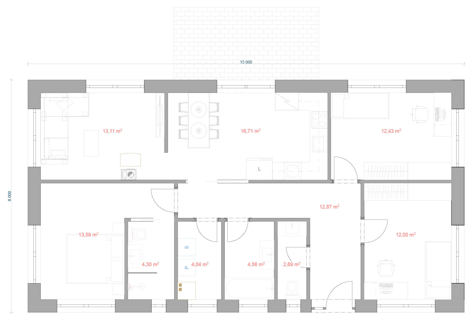Dům je navržen s hlavní ložnicí a dalšími dvěma pokoji, které mohou sloužit jako dětské pokoje, kancelář nebo pokoj pro hosty. Otevřená kuchyň spojená s prostorným obývacím pokojem vytváří ideální prostor pro rodinné setkávání a společné aktivity. K dispozici jsou také dvě koupelny, které usnadňují denní rutinu a zajišťují pohodlné bydlení.